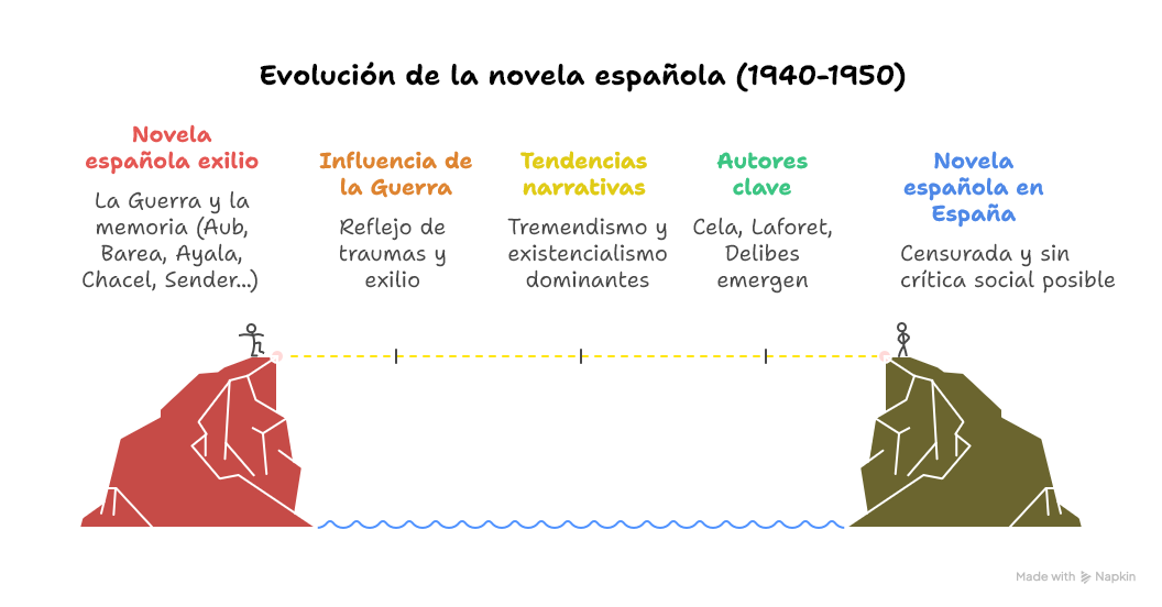 - La Guerra Civil y la dictadura franquista provocan una ruptura generacional, el exilio de muchos escritores y una implacable censura, lo que condiciona de manera decisiva el desarrollo de la narrativa española. Tras 1939 el panorama cultural es desolador: gran parte de los autores afines a la República (Ramón J. Sender, Max Aub, Francisco Ayala, Rosa Chacel, etc.) se exilian, y su obra se desarrolla fuera de España, a menudo centrada en la Guerra Civil y el exilio. Esta marcha masiva corta la continuidad de las corrientes de los años 30 y crea dos espacios narrativos: la literatura del exilio y la literatura del interior, sometida a una dura censura y a la propaganda franquista.