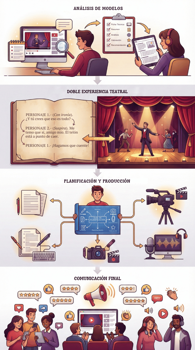 - Fase 4ª. Representación y reflexión final: escenificación breve y debate sobre las diferencias entre narrativa y teatro.