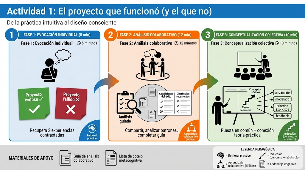 - Evocado experiencias docentes reales (proyectos exitosos vs. fallidos) para identificar elementos de éxito en el diseño didáctico.