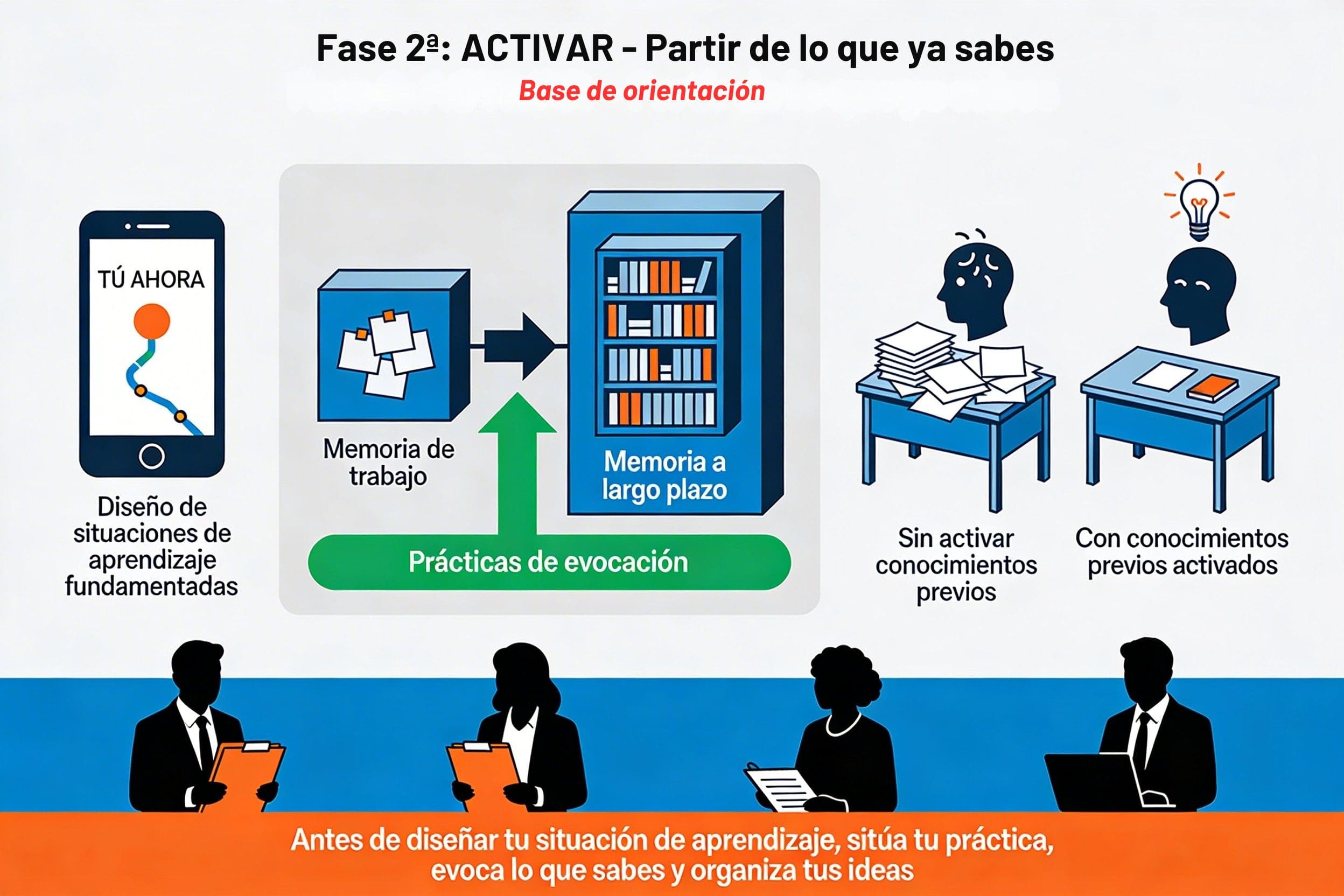 - Activación estratégica: traer a vuestra memoria de trabajo los saberes previos que necesitaréis en las siguientes fases para diseñar vuestra situación de aprendizaje.